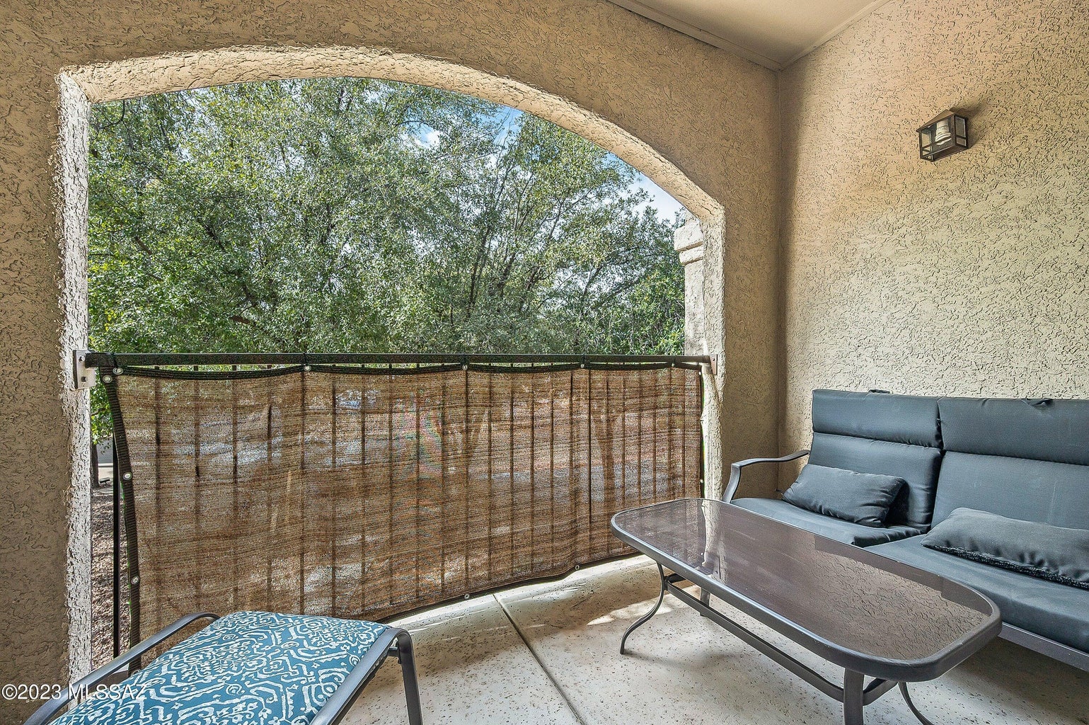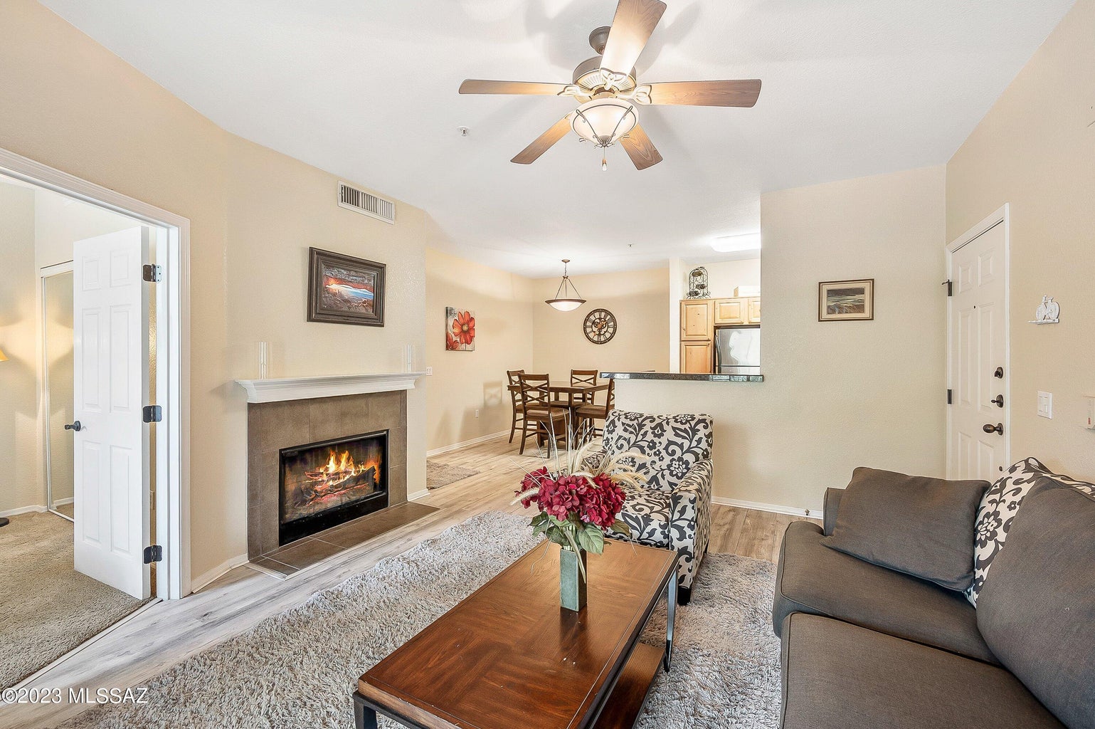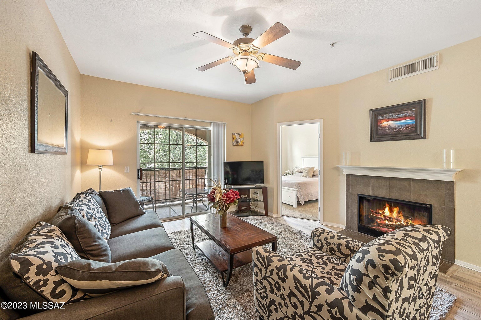 Luxurious fully furnished second floor condo with Catalina Mountain views in the prestigious community of The Boulders at La Reserve Condominium. This remodeled property features 9 ft ceilings, dramatic arched window, private primary bedroom with roomy walk in closet, luxury vinyl flooring, open kitchen with stainless steel appliances & granite counters, romantic wood burning fireplace, washer / dryer included, covered balcony and bathroom with dual sinks & garden tub. The HOA resort style amenties include a tranquil heated pool & spa with sparkling fountain, fully equipped fitness center & separate weight room, spacious community clubhouse with business center & kitchen, picnic areas with bbq grills, beautifully landscaped grounds and a popular Oro Valley location near shopping, restaurants and Catalina State Park