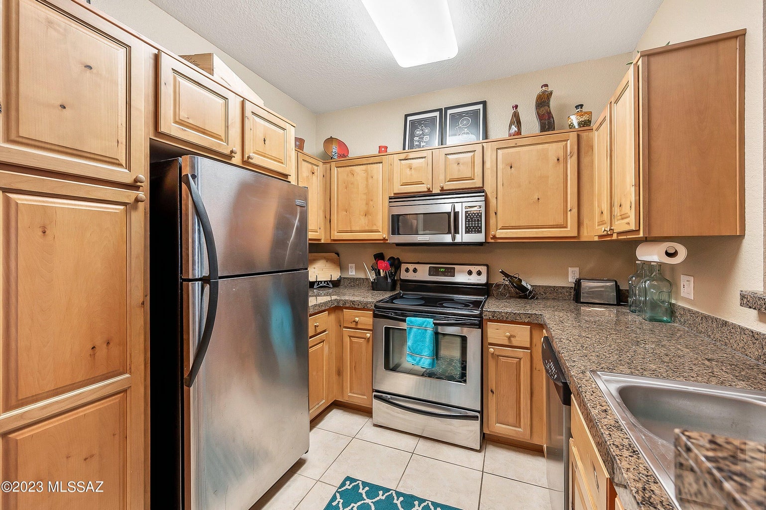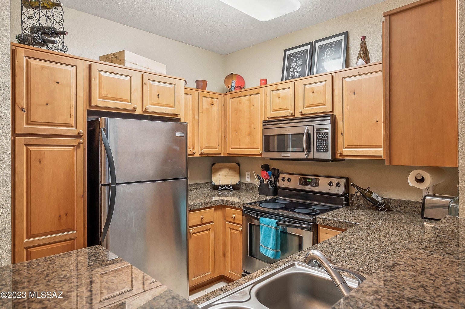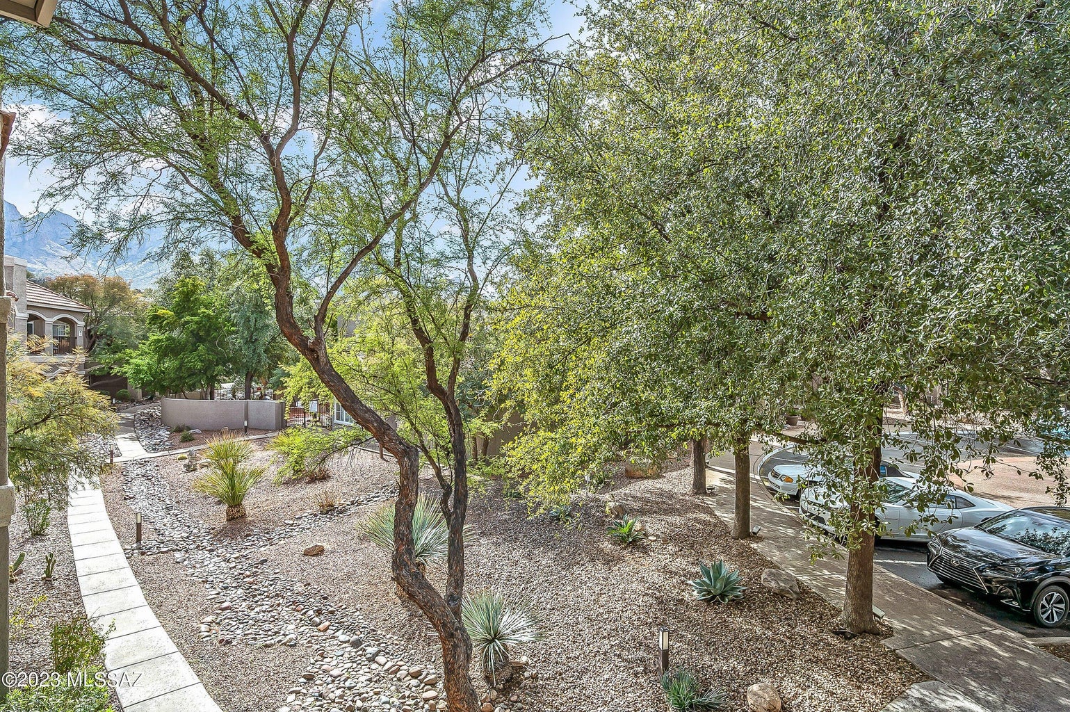 Luxurious fully furnished second floor condo with Catalina Mountain views in the prestigious community of The Boulders at La Reserve Condominium. This remodeled property features 9 ft ceilings, dramatic arched window, private primary bedroom with roomy walk in closet, luxury vinyl flooring, open kitchen with stainless steel appliances & granite counters, romantic wood burning fireplace, washer / dryer included, covered balcony and bathroom with dual sinks & garden tub. The HOA resort style amenties include a tranquil heated pool & spa with sparkling fountain, fully equipped fitness center & separate weight room, spacious community clubhouse with business center & kitchen, picnic areas with bbq grills, beautifully landscaped grounds and a popular Oro Valley location near shopping, restaurants and Catalina State Park